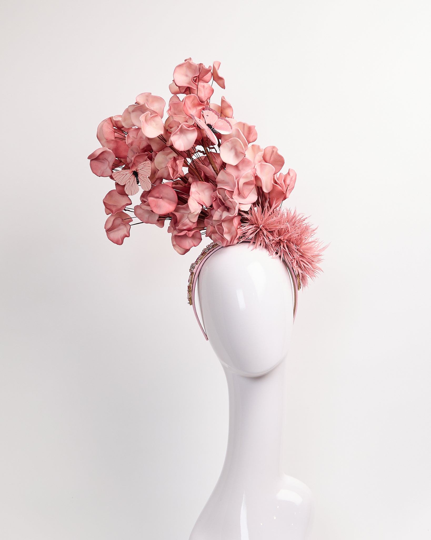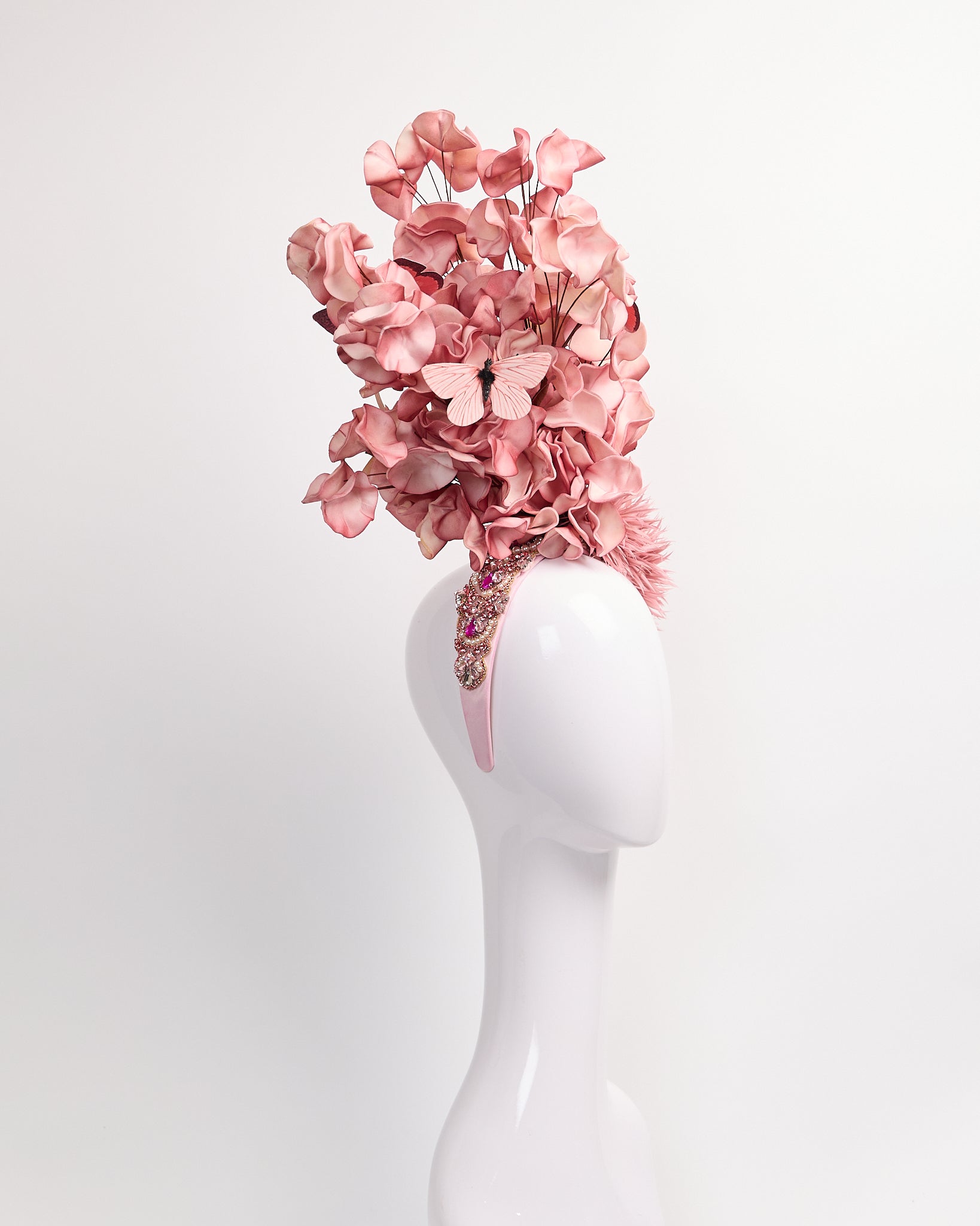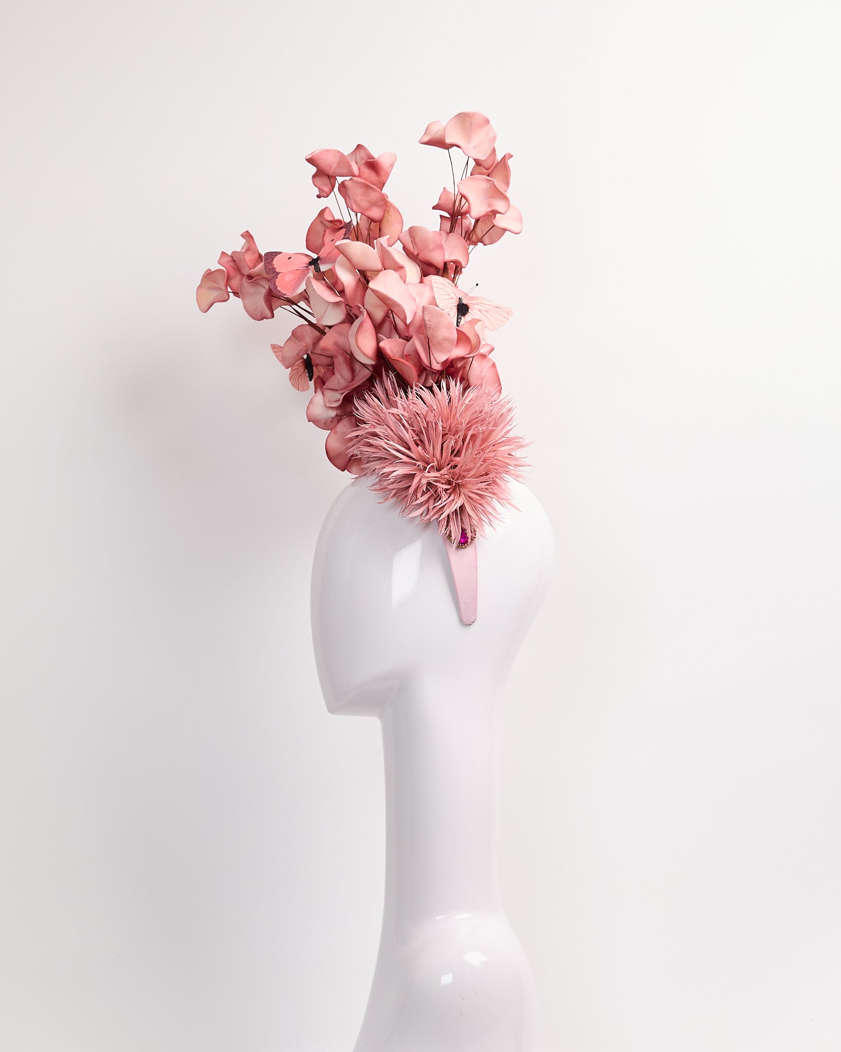 Pink, pearl beaded headband with mauve foam flowers, butterfly accents &mauve feather biot pom poms
