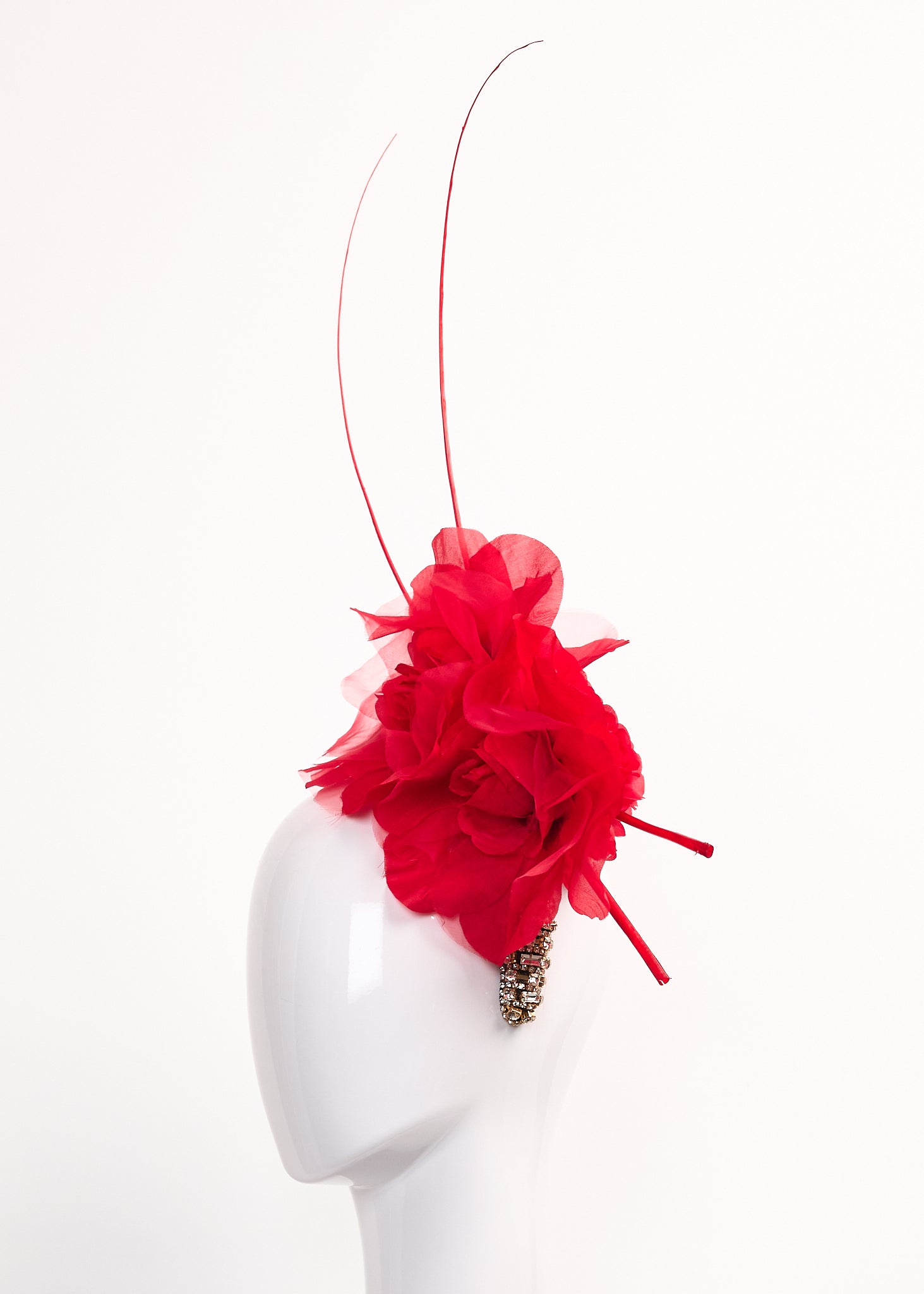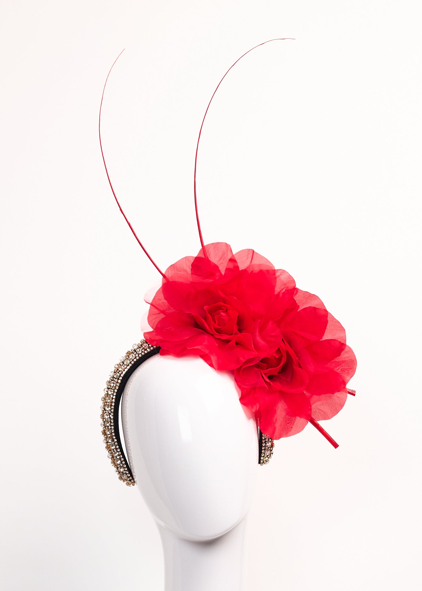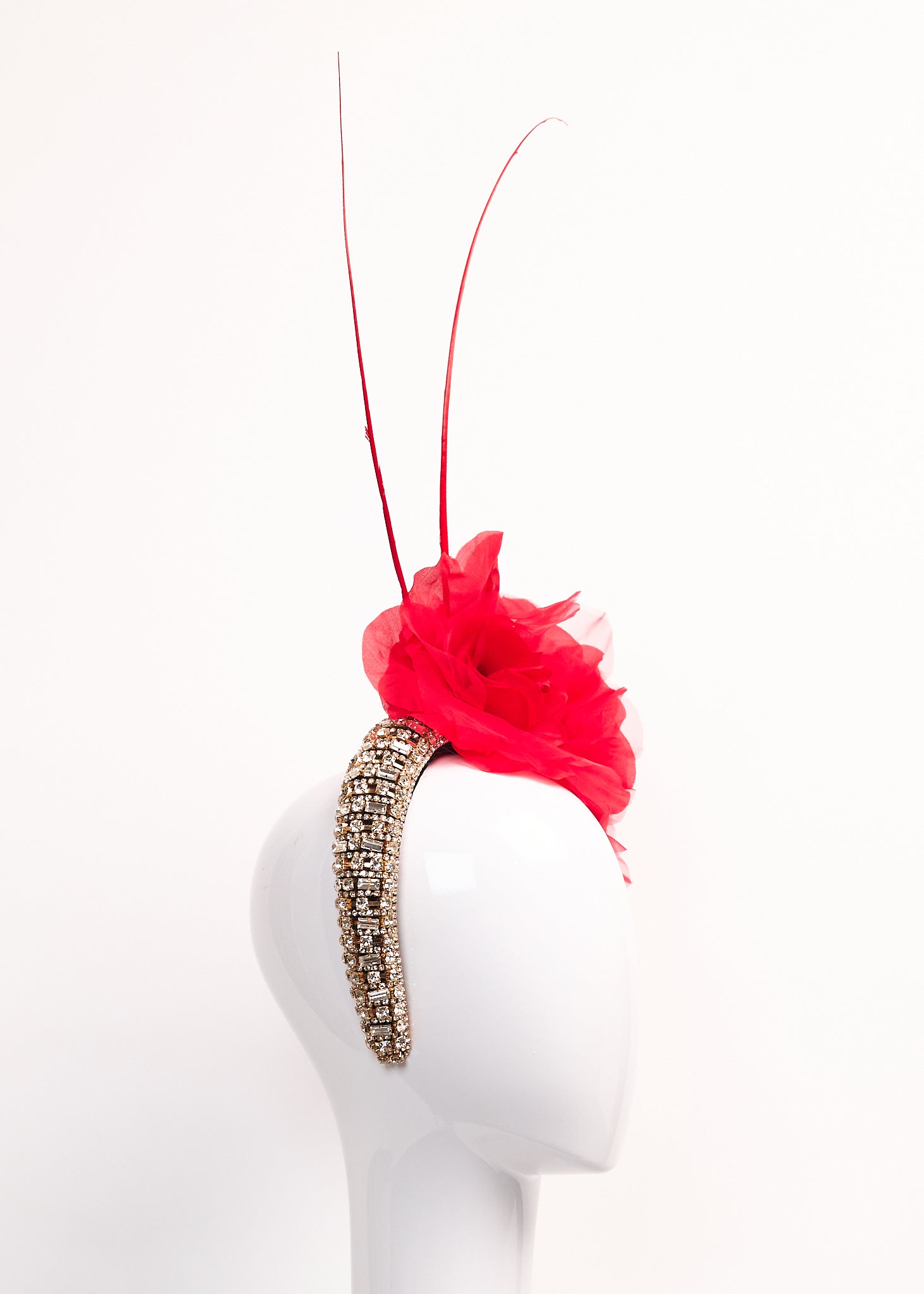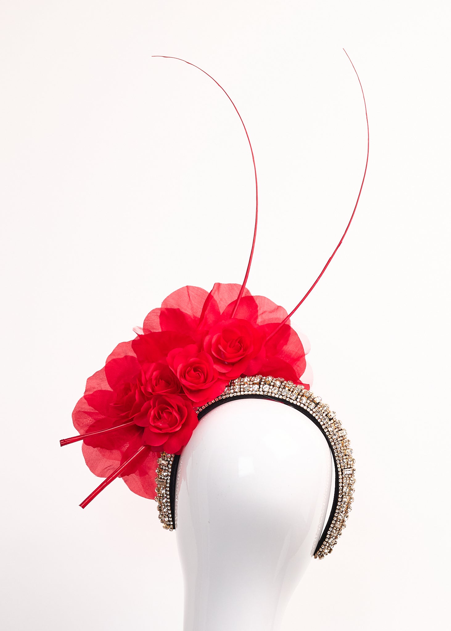 Gold and silver beaded crown with small and large red silk roses and red spine accents.