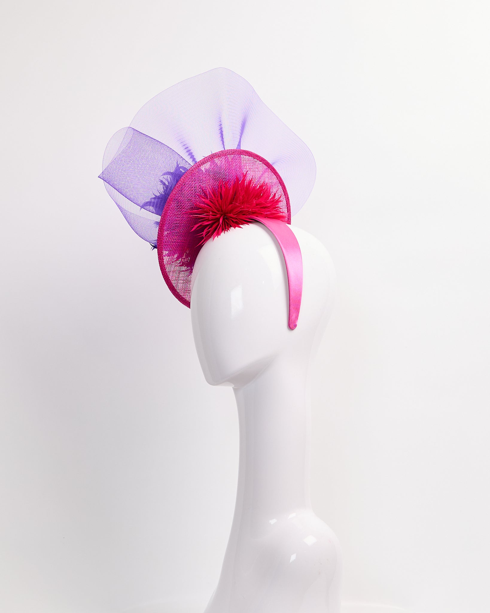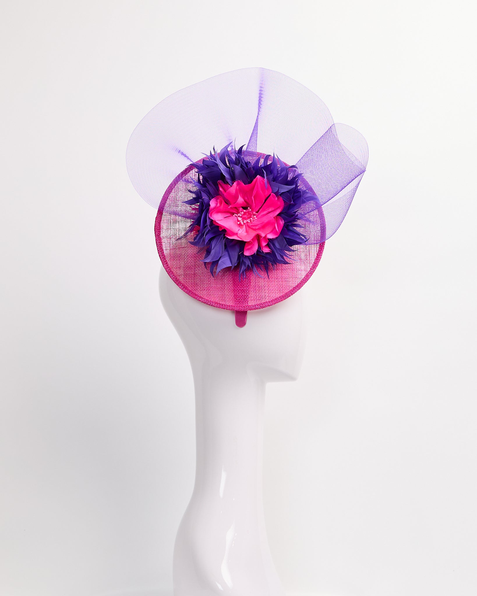 Fuchsia sinamay fascinator with purple feather flower, pink silk flower, purple horse hair accents & fuchsia biot feather poms