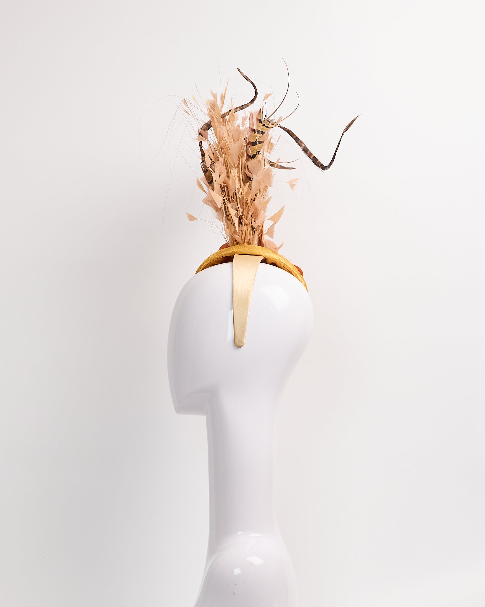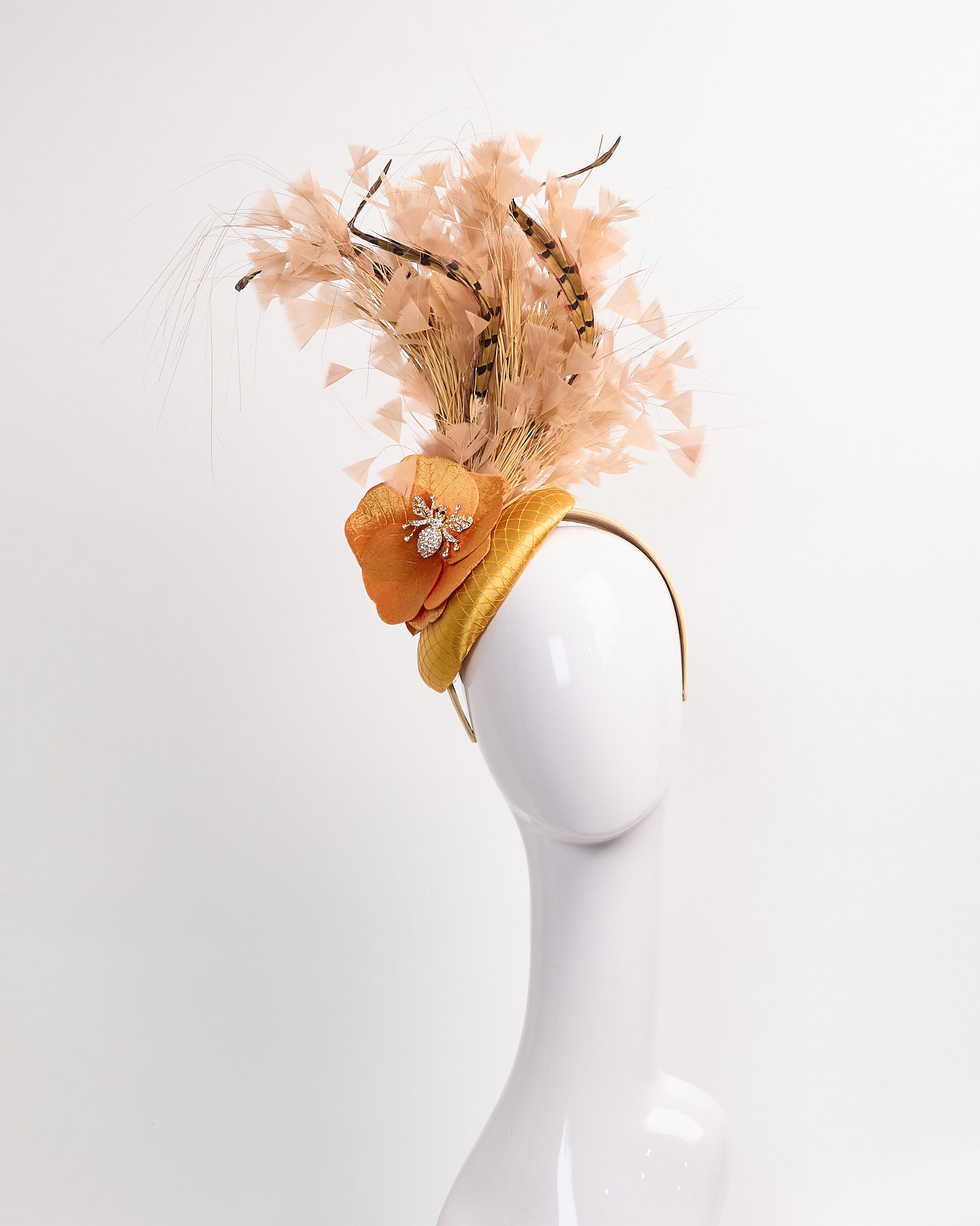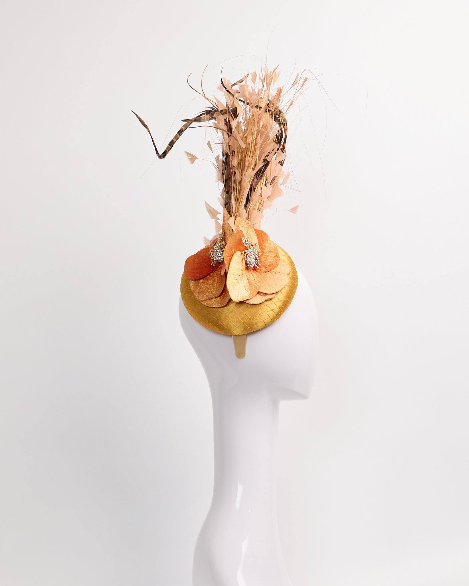 Gold sinamay fascinator with satin/ netting overlay with gold flowers with bee rhinestone broches, apricot feather mounts & black and brown pheasant feathers.
