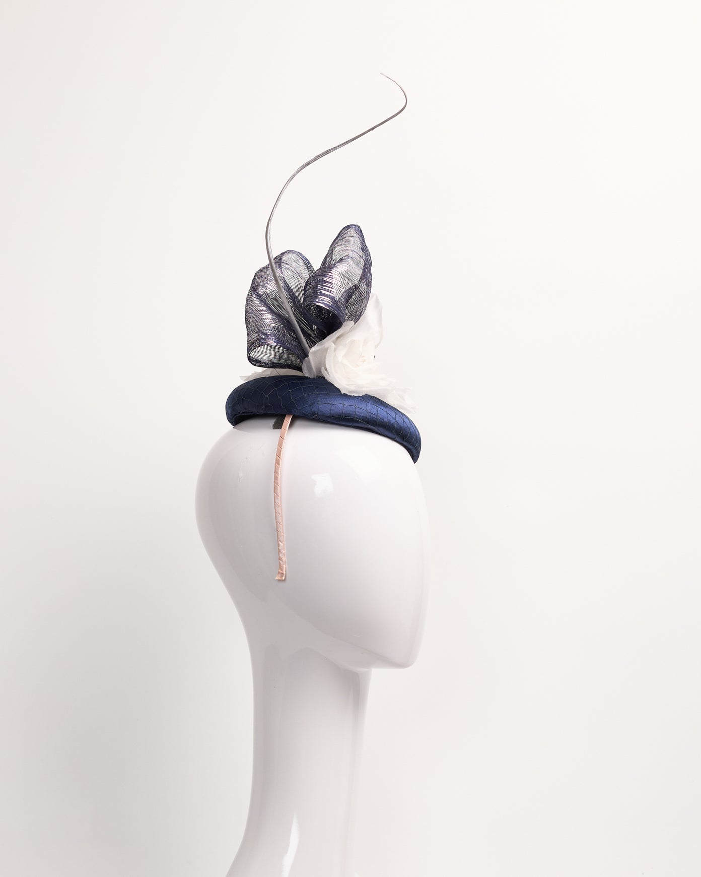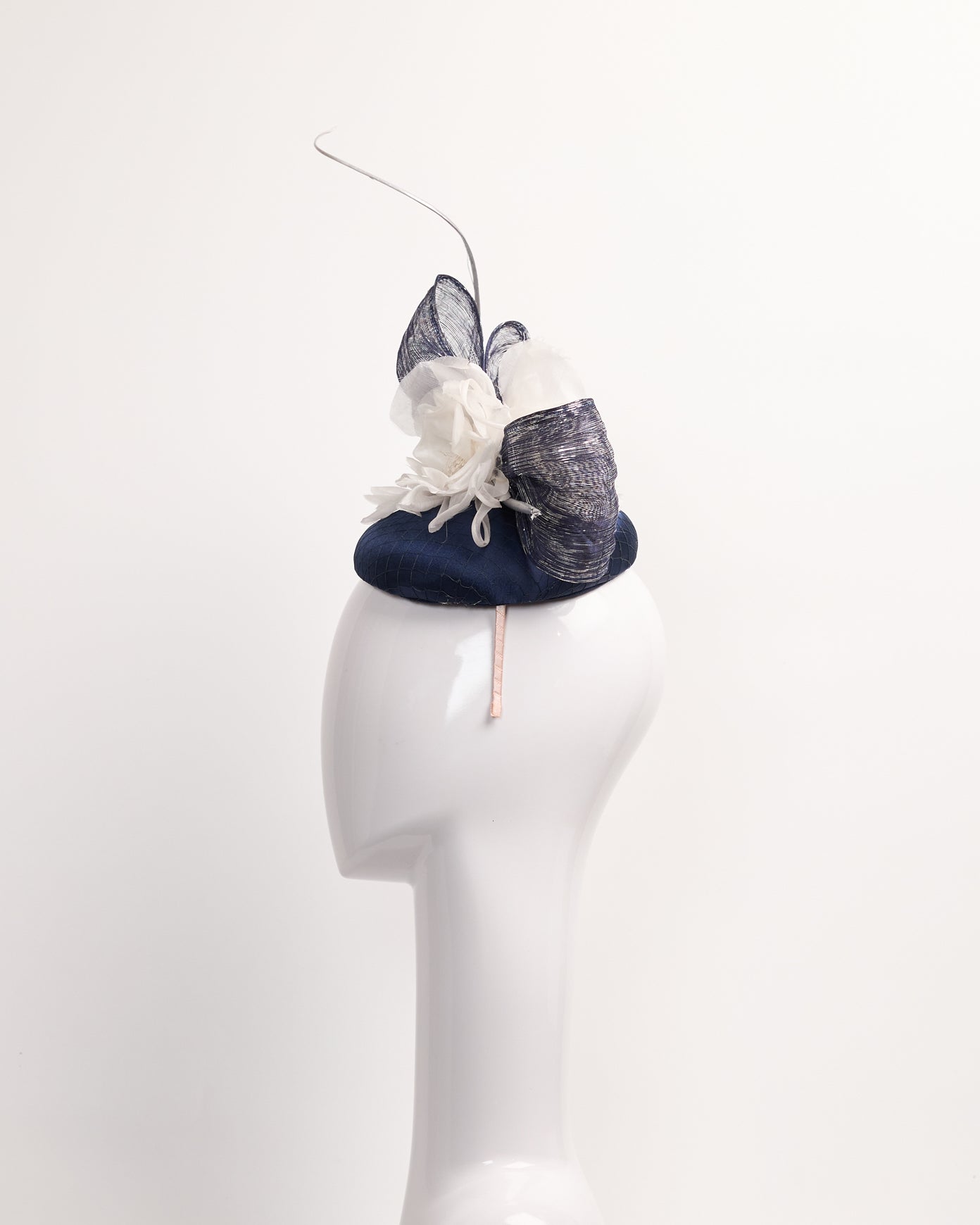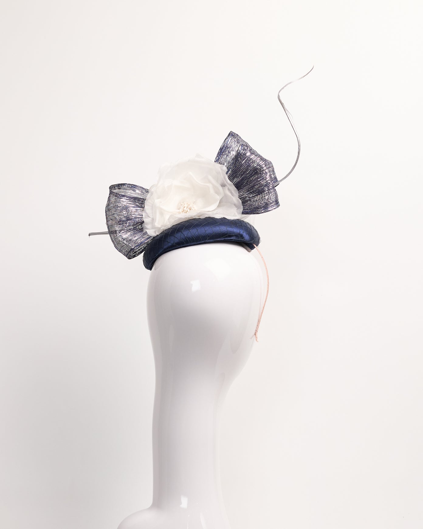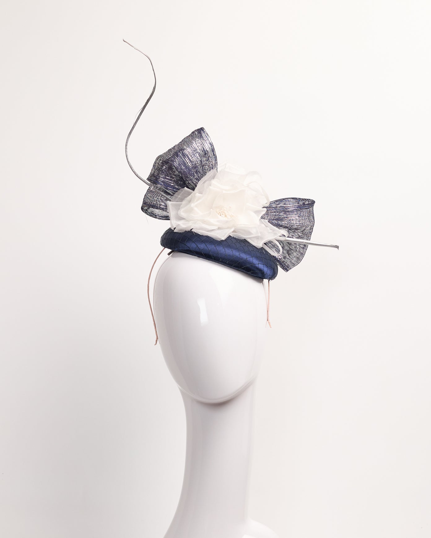 Navy sinamay fascinator with satin and black netting overlay, white silk flowers, navy and metallic silver bows and silver spine