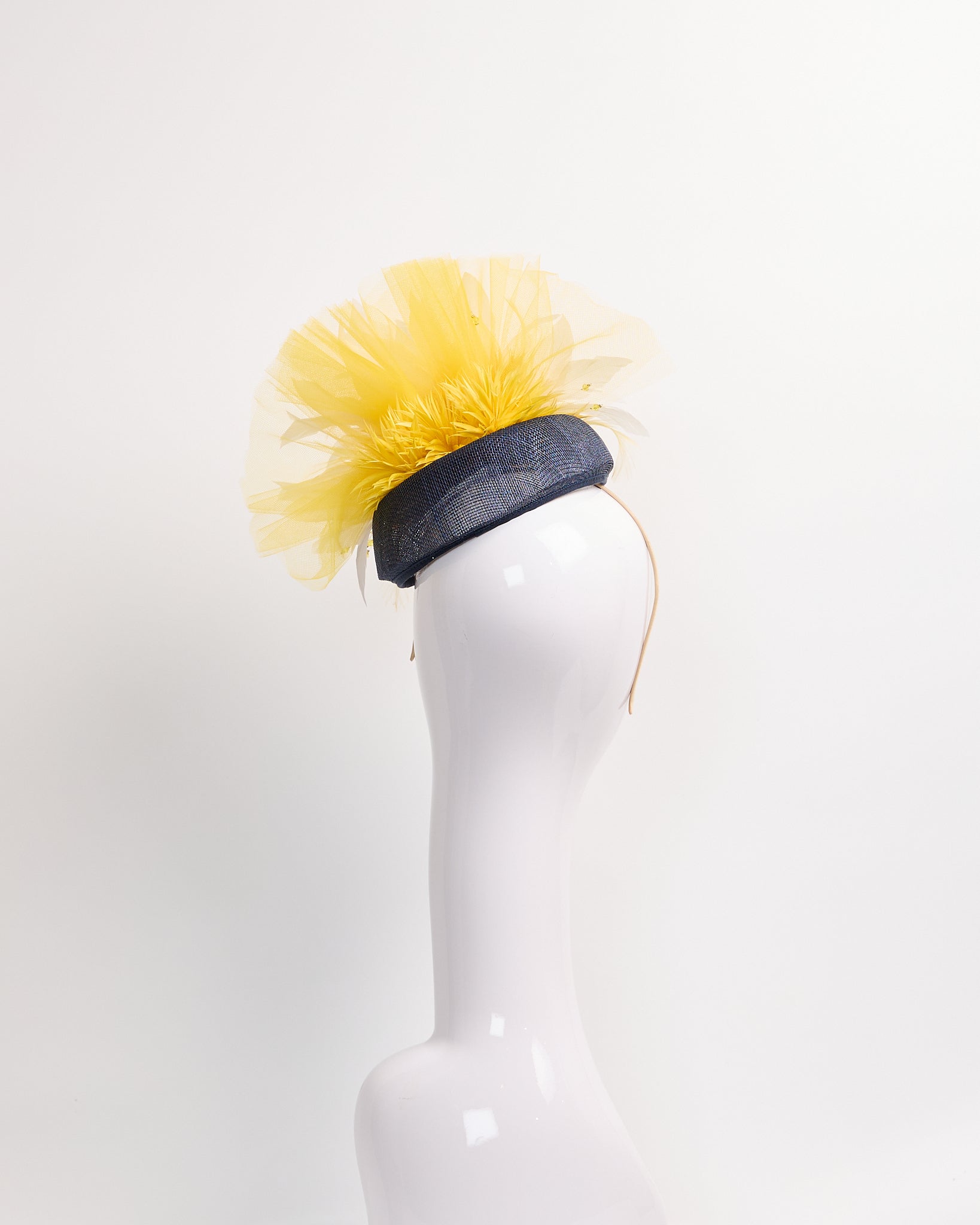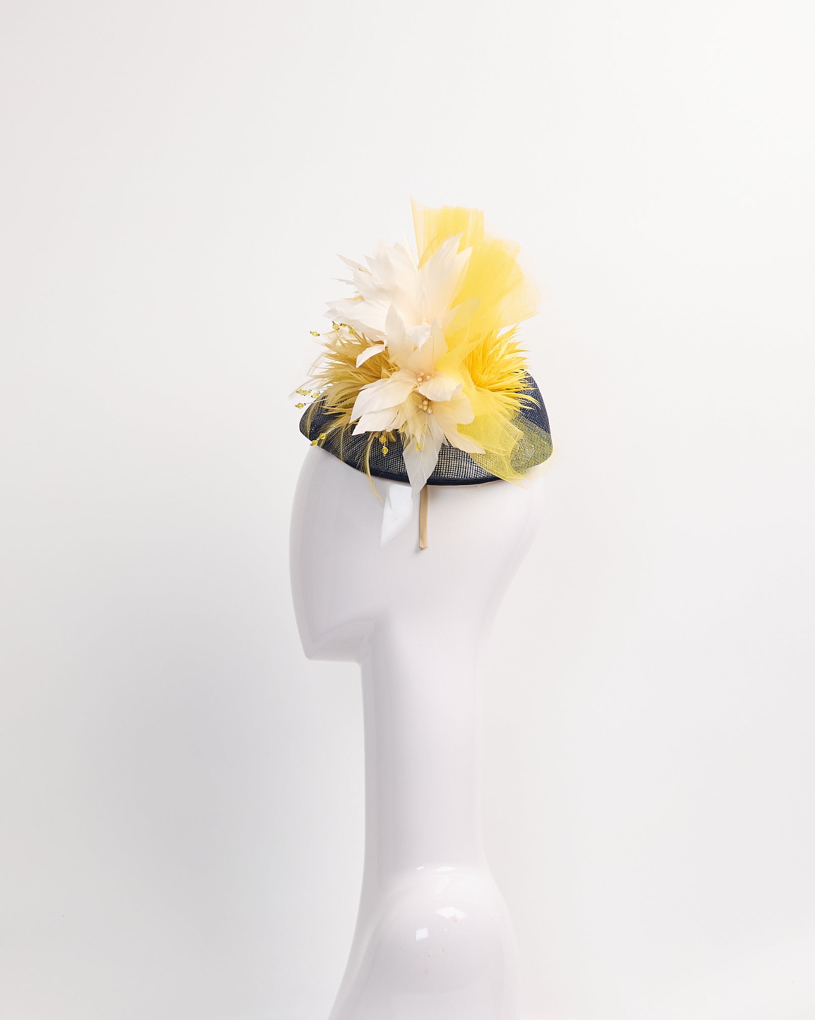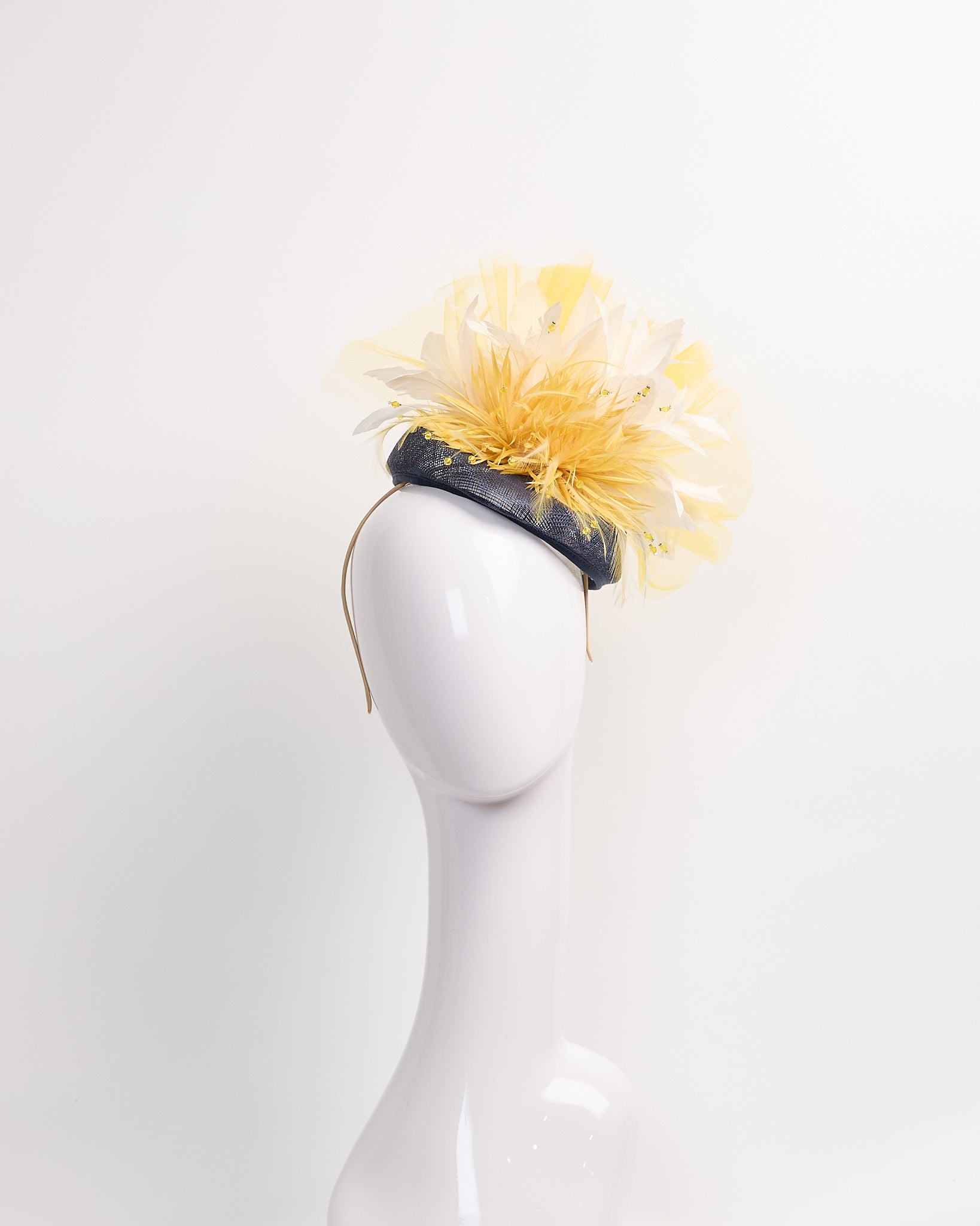 Navy Sinamay fascinator with yellow feather biot pom poms, white feathers and yellow tulling
