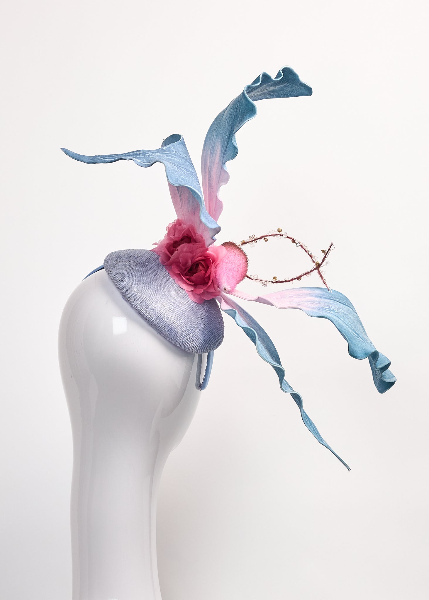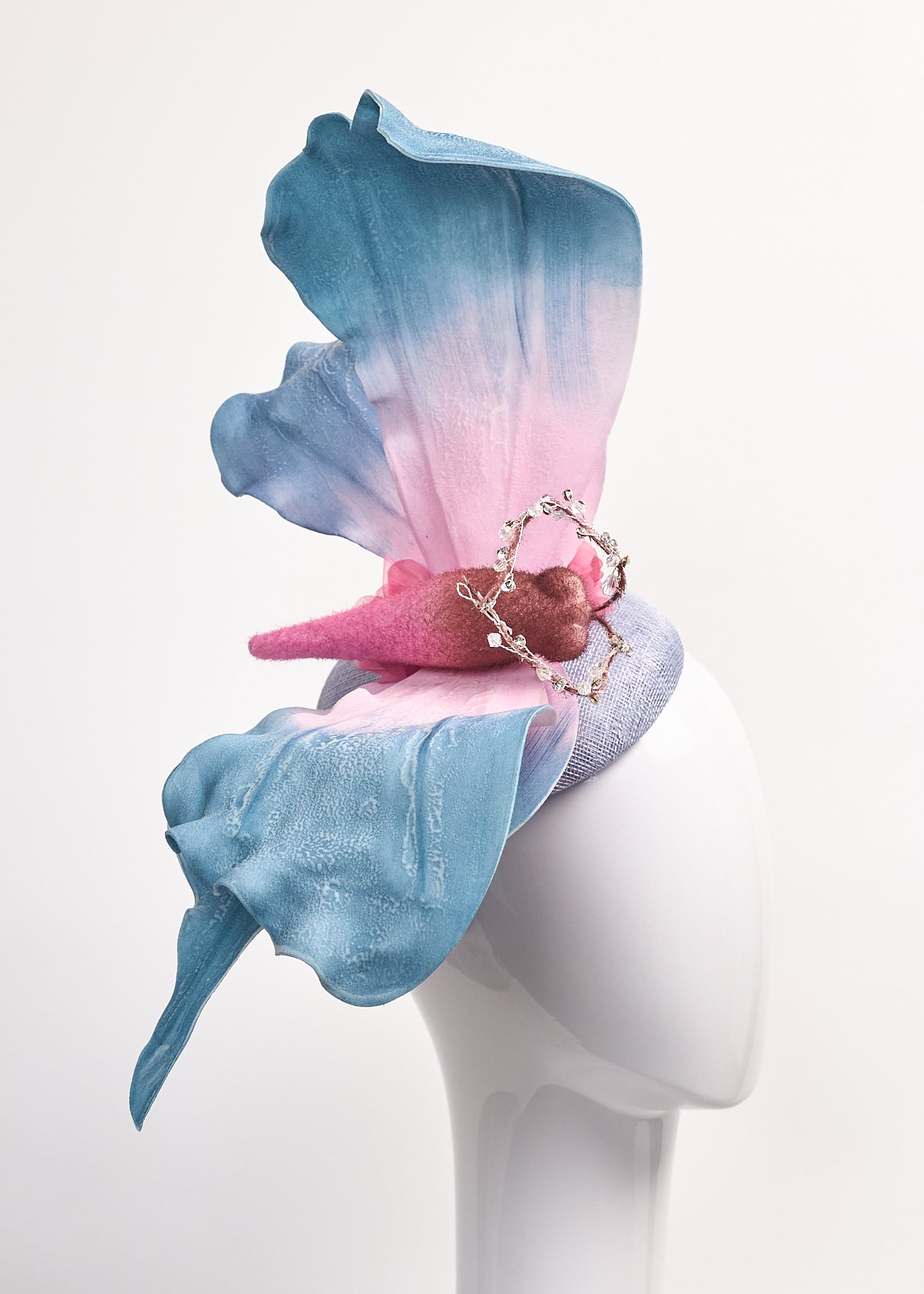 Periwinkle fascinator with large foam pink and blue butterfly and mauve silk roses.