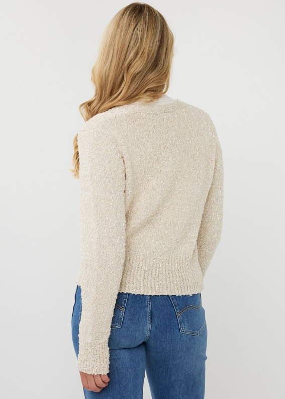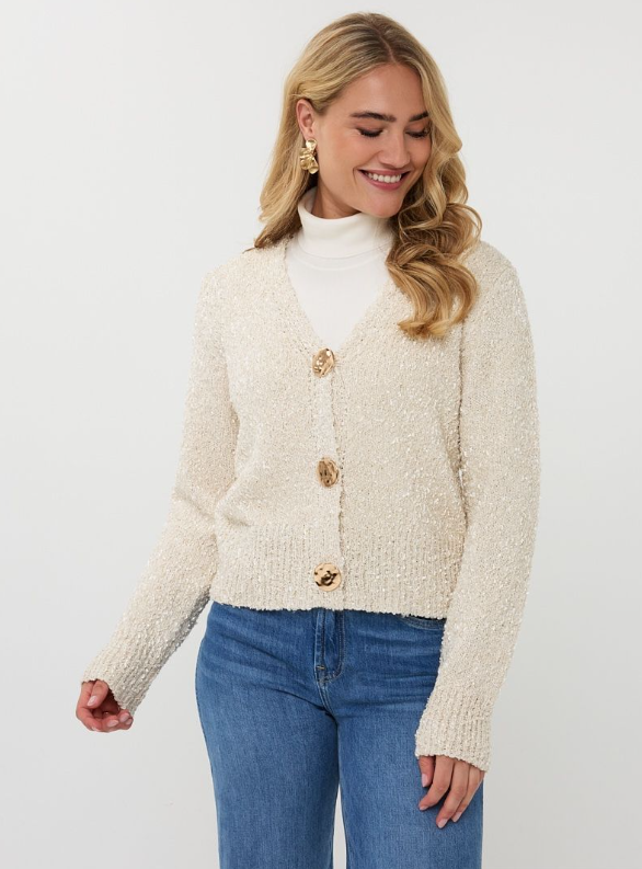 This slightly shiny knit cardigan is an elegant addition to your fall wardrobe. The unique large gold buttons give it a chic touch and make it a real eye-catcher.