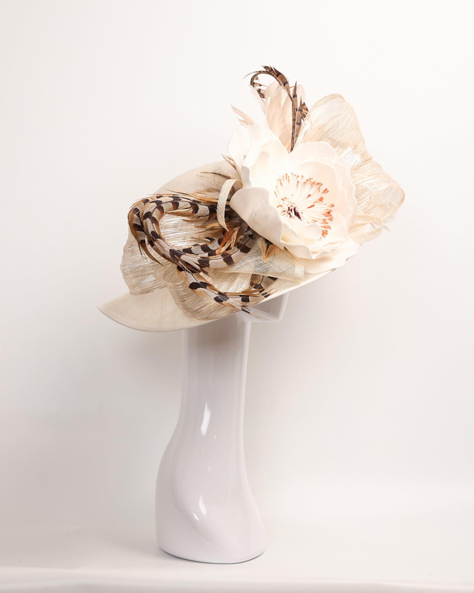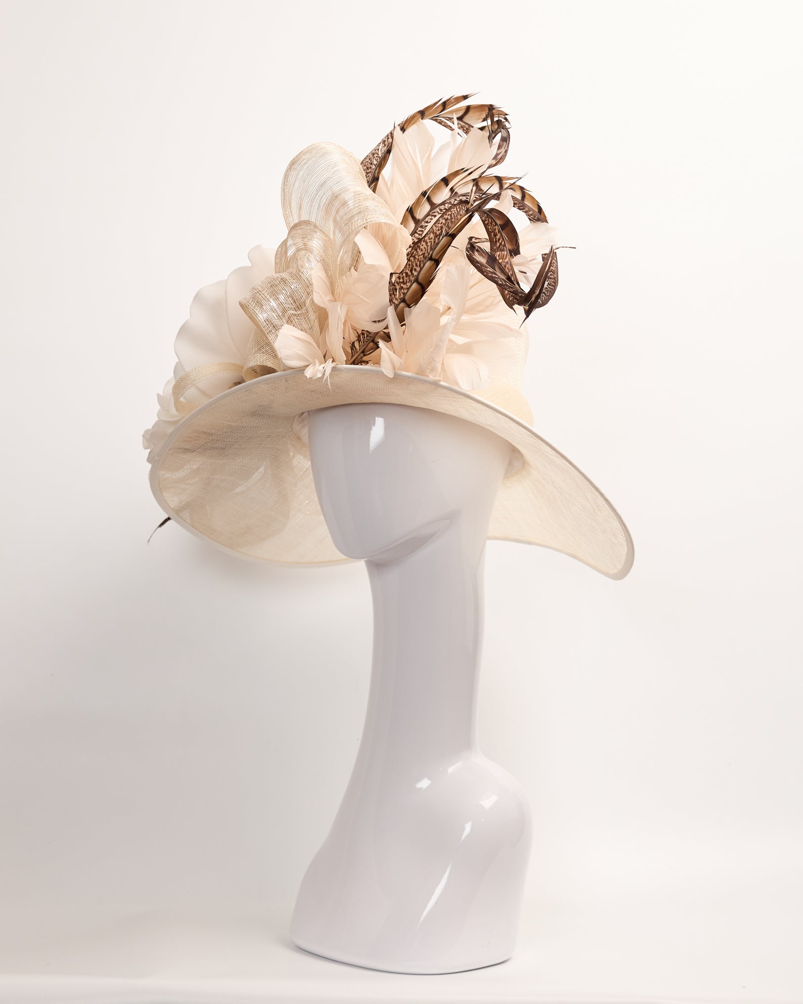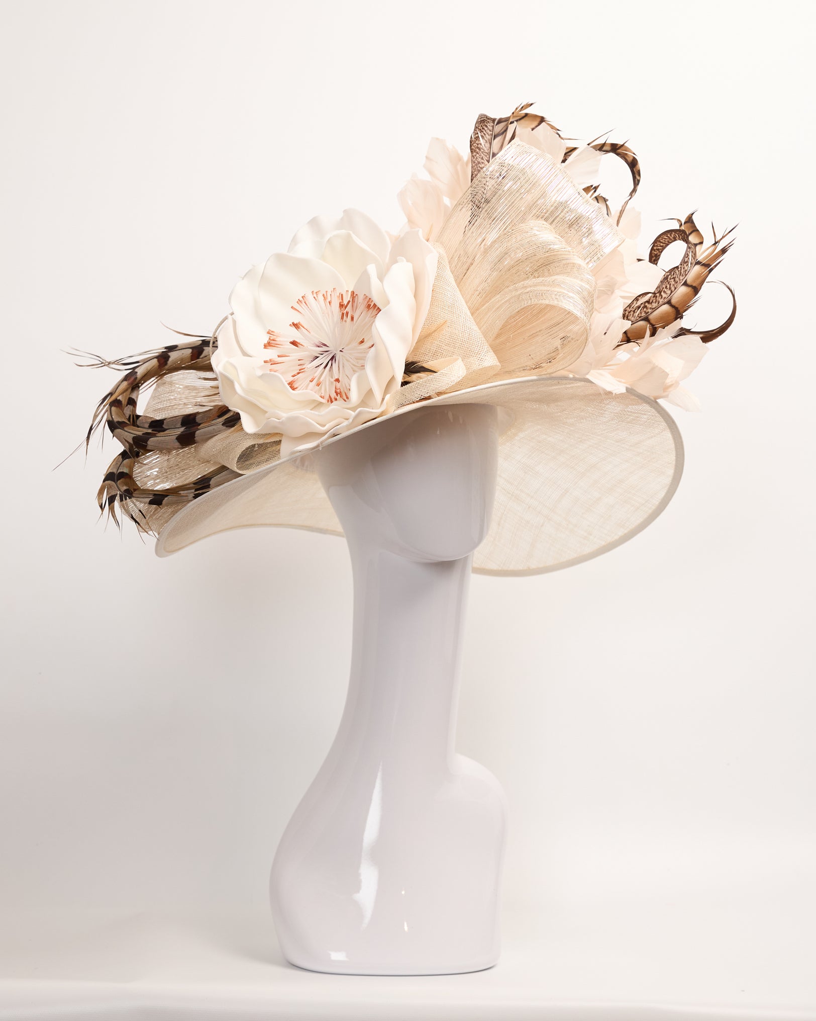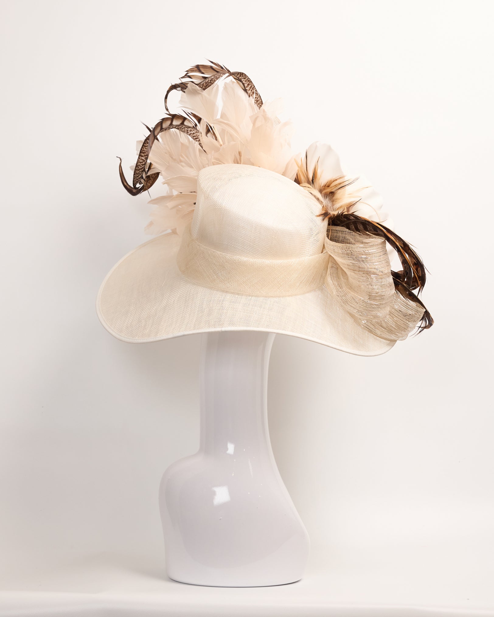 Cream sinamay hat with creamy white foam flower, cream sinamay bows and ribbon accents, cream and metallic silver bows, cream feathers, cream, black and brown pheasant feathers, & hackle feathers