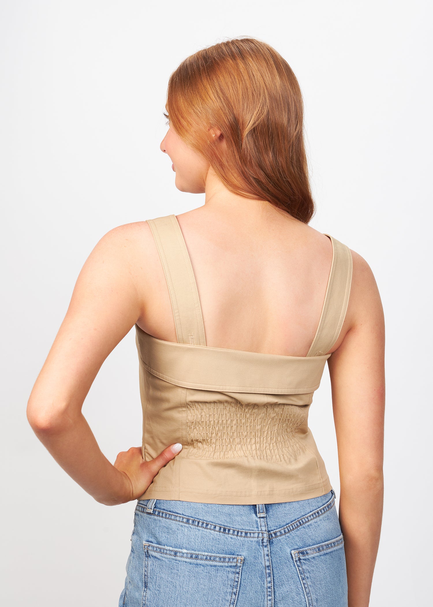 The Lightweight Trench Top takes cues from classic outerwear, reimagined in a flattering, warm-weather silhouette. It features a square neckline with a foldover collar, double-breasted button front, and thick adjustable straps. A smocked back panel keeps the fit easy and secure, making it a structured piece that doesn’t sacrifice comfort.